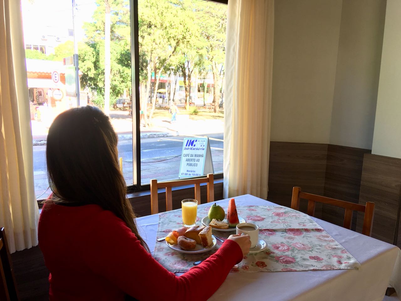Você pode desfrutar de um ótimo café da manhã no hotel, que inclui uma variedade de itens como: frutas, cereais, pães, sucos e uma seleção de bolos deliciosos.